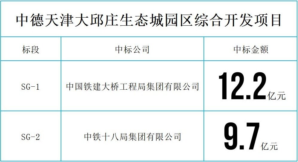 On August 6, 2021, China Railway Construction Bridge Bureau and China Railway Eighteenth Bureau welcome the Sino-German Tianjin Daqiuzhuang Eco-city Park Comprehensive Development Project, west of Gang Tuanhe, Daqiuzhuang Town, Jinghai District, north of Tuanbo Avenue, and south of Qingnian Canal , Planning to the east of Lintian Road (tentative name). The specific development scope is subject to the plan approved by the government. The total investment is 2.19 billion yuan.