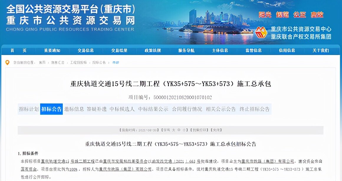 It is understood that the owners of the two projects are Chongqing Railway (Group) Co., Ltd., the construction funds come from state-owned funds, the project investment ratio is 100%, and the estimated contract amounts are 5.79 billion yuan and 5.09 billion yuan respectively. The planned construction period of the second phase of Chongqing Rail Transit Line 15 is 63 months.