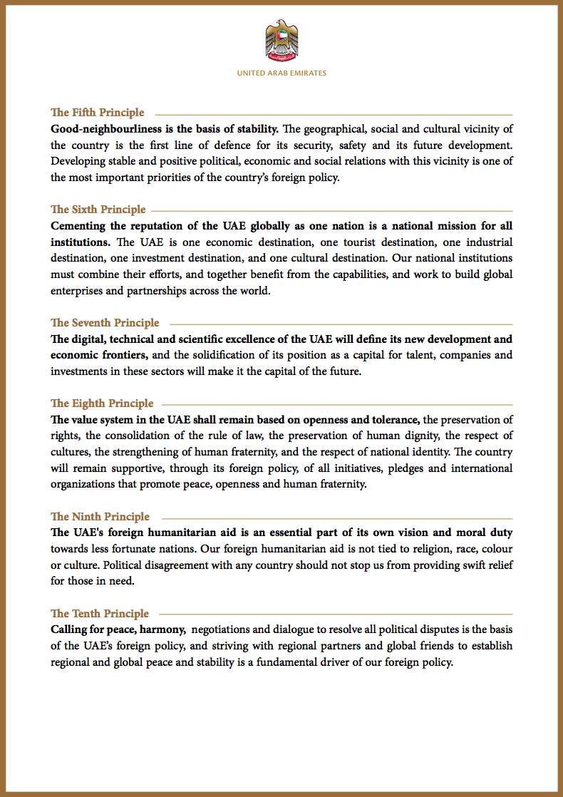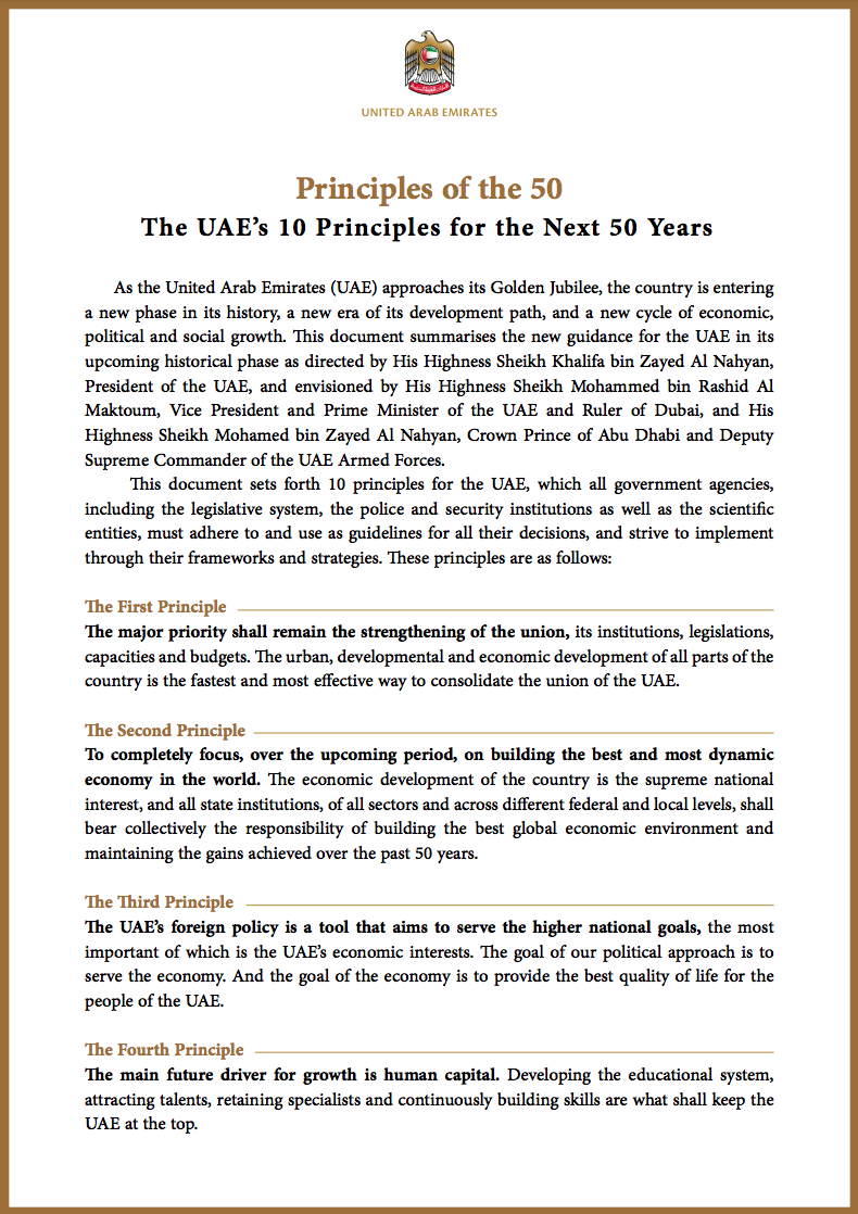 The leaders of the UAE announced 10 principles that will govern the country’s future for the next 50 years. The document entitled "The 50-person principle" was developed by His Highness Sheikh Mohammed bin Rashid Al Maktoum, Vice President, Prime Minister and Ruler of Dubai, and Crown Prince Sheikh Mohammed bin Zayed. His Highness Al Nahyan jointly announced the Deputy Supreme Commander of Abu Dhabi and the UAE Armed Forces.