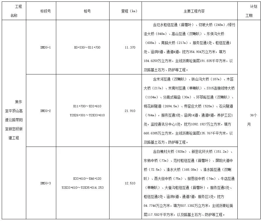 Henan Transportation Development Group Co., Ltd. is divided into three bidding sections for the new construction of the Xingyang-Xinmi section of the Jiaozuo-Pingdingshan Expressway. The specific sections are shown in the table below.