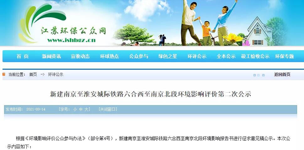 On September 14, 2021, Jiangsu Railway Group Co., Ltd. issued the "Second Public Announcement of Environmental Impact Assessment for the Newly-built Nanjing-Huai'an Intercity Railway from Liuhe West to Nanjing North Section". The publicity period is 10 working days.