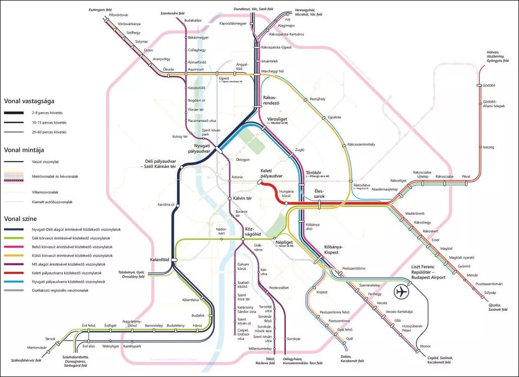 The goal is to provide a 20-minute travel time from the city center to Liszt Ferenc International Airport and to add 16 new stations to the network. The new lines and facilities will also save up to 1 hour and 10 minutes for freight services when traveling through the city. This strategy will reduce the average travel time of passengers by about 15 minutes, thereby saving the national economy 150 billion HUF (507.8 million US dollars). The 200-hectare railway property will also be restored.