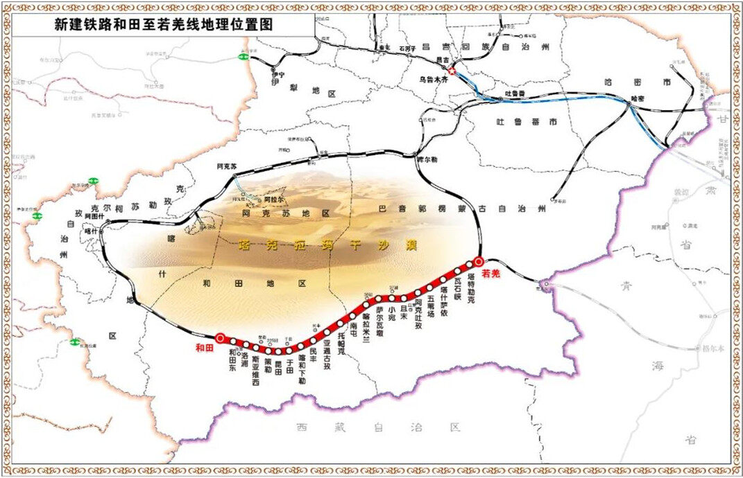 It is reported that the Heruo Railway leads from the Hetian Station of the South Xinjiang Railway, passing through Luopu, Cele, Yutian, Minfeng, Qiemo, Ruoqiang and other counties and cities, and finally connects to the Ge (Ermu)-Ku (Erle) Railway in Ruopu, Cele, Yutian, Minfeng, Qiemo, and Ruoqiang. Qiang Stations meet and form a railway loop around the Tarim Basin. By then, the history of no trains in five counties including Luopu, Cele, Yutian, Minfeng, and Qiemo will end, and the journey of Hetian people will be shortened by more than 1,000 kilometers, which is conducive to promoting high-quality economic and social development in southern Xinjiang. Editor/He Yuting