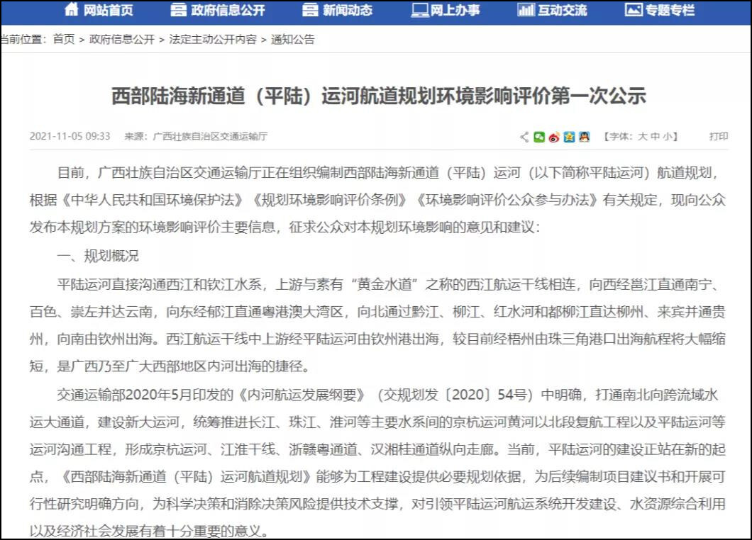 In addition, according to the latest news from the Guangxi Transportation Department, currently, Pinglu Canal has completed the project-related special studies, and the project approval is expected to be completed by the end of 2021.