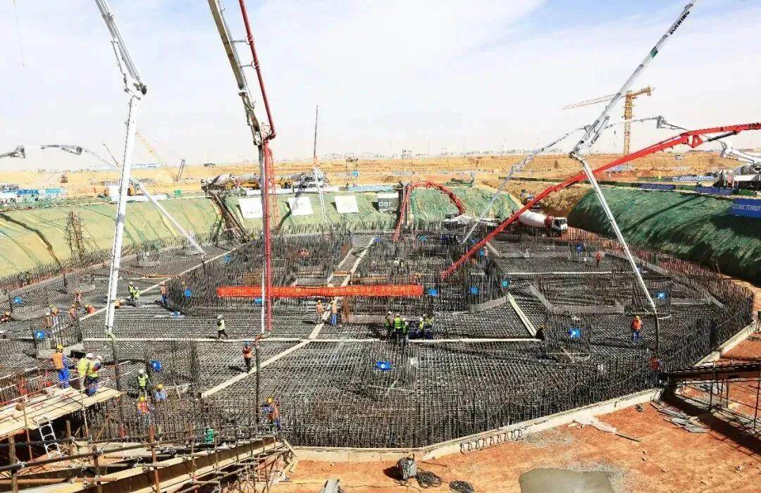The pouring of the super-large foundation slab was originally expected to be completed in 72 hours, but the entire pouring process took only 38 hours, creating an astonishing rate of 785 cubic meters of pouring in a single hour during the peak period. This is the first time that China State Construction Group has made "how fast and save" Chute technology was brought to Egypt.