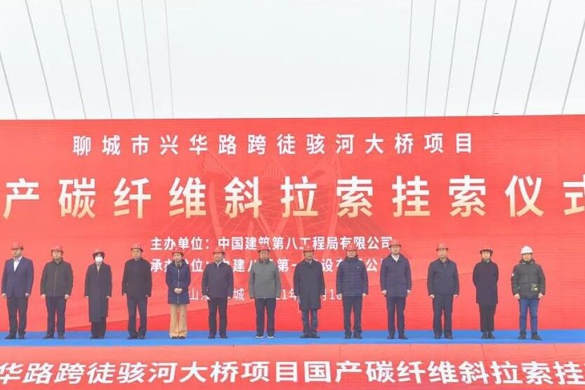 On December 10, 2021, the home-made carbon fiber stayed cable hanging ceremony of the Xinghua Road Crossing Haihe Bridge Project was held in Liaocheng, Shandong. This marked the first time that domestic carbon fiber was used in the main cable of the bridge. The carbon fiber stay cables for this project were provided by LiuGong Ouweimu.