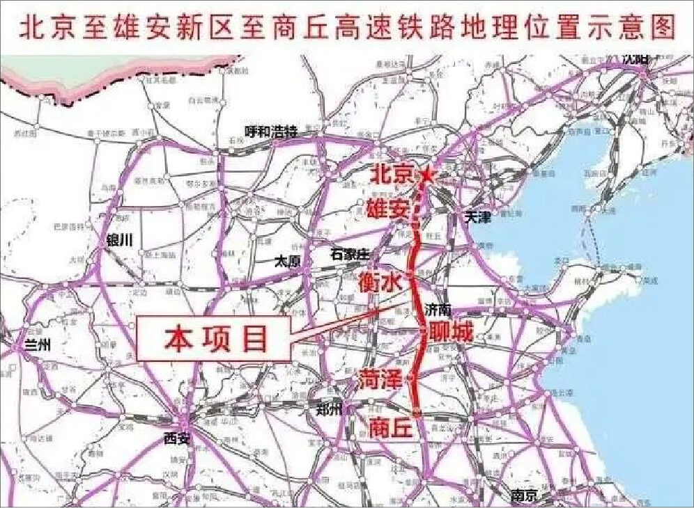 The project is located in Hebei Province, Shandong Province and Henan Province, including the main line and related works. The main line starts from Xiongan Station (not included), passes through Xiongan New District, Cangzhou City, Hengshui City, Xingtai City in Hebei Province, Liaocheng City, Jining City, Heze City in Shandong Province, Puyang City and Shangqiu City in Henan Province, and connects to Shangqiu Station (not included), the total length of the line is 552.8 kilometers. The total investment is about 82.7 billion.