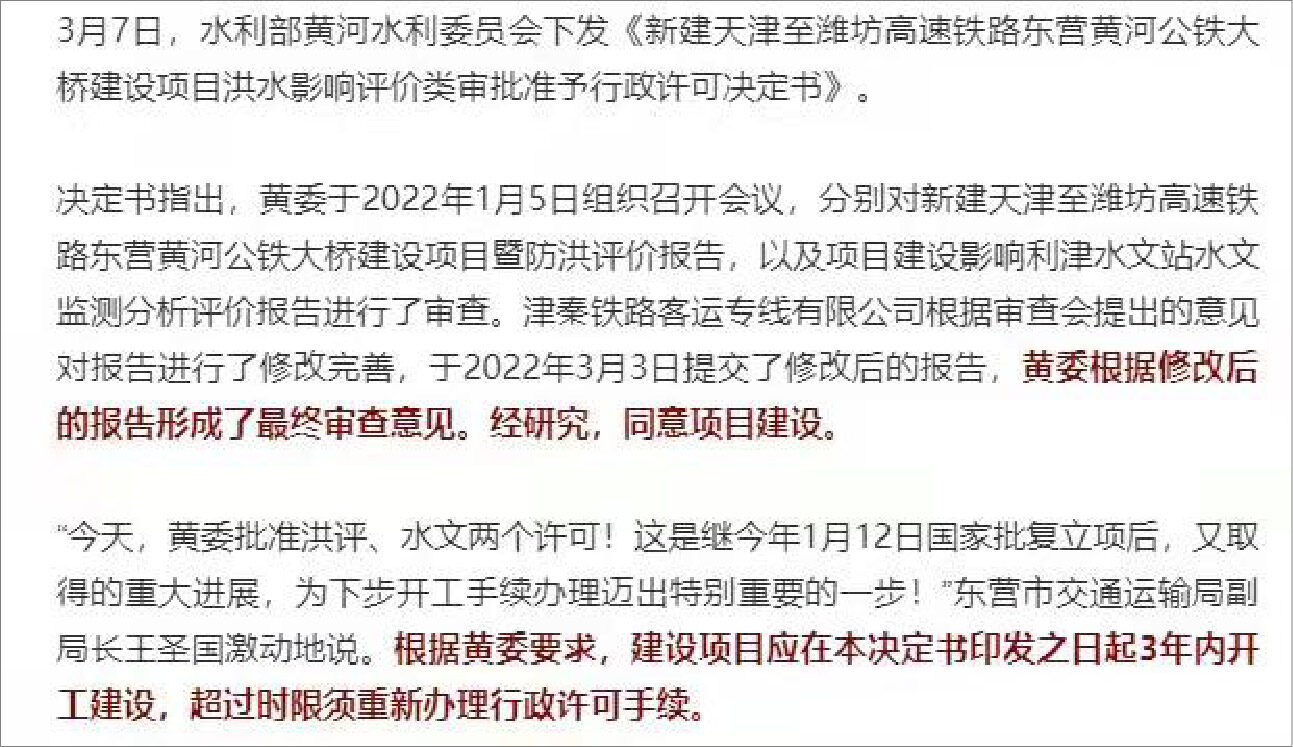 On January 12, 2022, the National Development and Reform Commission issued the "Approval of the Feasibility Study Report on the New Tianjin-Weifang High-speed Railway", marking the official establishment of the new Tianjin-Weifang high-speed railway (including the Jibin high-speed railway) project and entering into substantive implementation. stage.