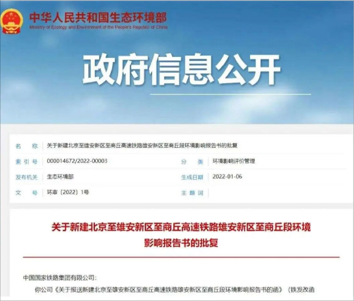 In January 2022, the official website of the Ministry of Ecology and Environment released the "Approval for the Environmental Impact Report of the New Beijing-Xiongan New Area-Shangqiu High-speed Railway Xiongan New Area-Shangqiu Section", stating that the project complies with the "Medium and Long-Term Railway Network Planning", and the national development The Reform Commission approved the project feasibility study report with the document No. 1740 of the Development and Reform Foundation [2020], and agreed to the project construction.