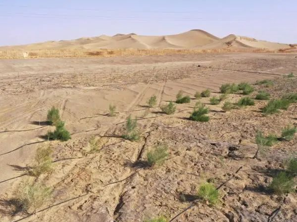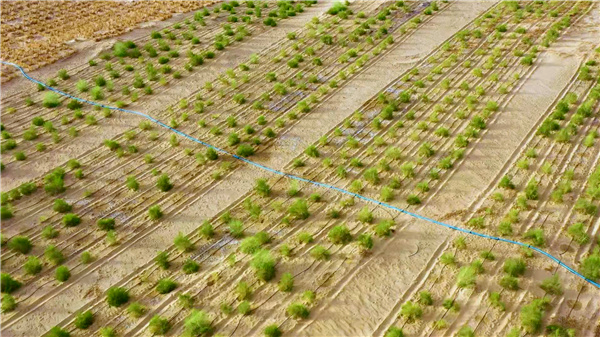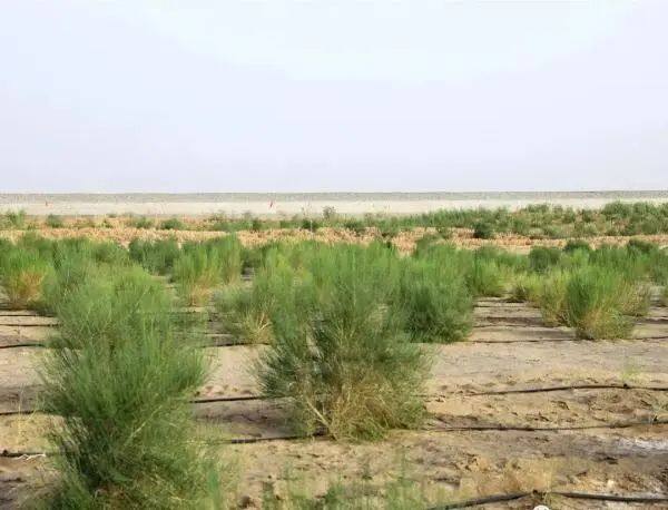 Between the sand barrier and the grass square, crops such as Haloxylon ammonium, red willow, Populus euphratica, etc., which are easy to grow in the desert, are planted. After that, the plants will play the role of sand control.