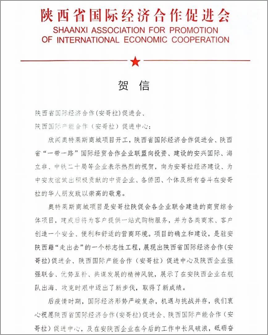 The Shaanxi International Economic Cooperation Promotion Association sent a congratulatory letter, saying that the establishment and construction of this project is a landmark project in the post-epidemic era. Shaanxi-based enterprises in Angola give full play to their respective advantages, develop together as a group, and jointly implement the "going out" strategy. Enterprises in Anxi and Shaanxi have taken new steps and achieved new achievements in the fleet going to sea and overcoming difficulties.