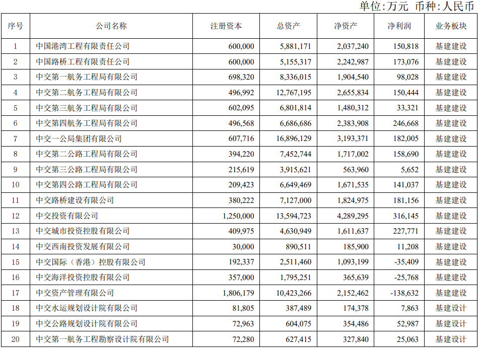 In addition to the above, CCCC's 2021 annual report also announced the basic information of major subsidiaries, including registered capital, total assets, net assets, net profit, etc. The details are as follows: