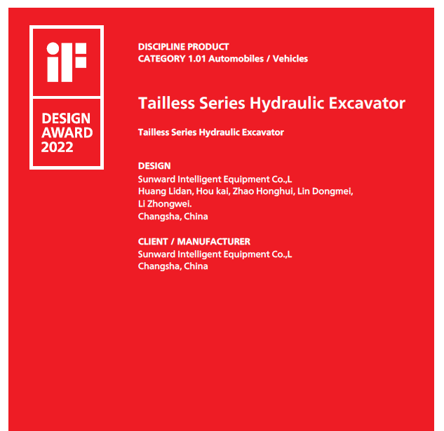 Recently, the 2022 international authoritative industrial design award "iF Design Award" (iF DESIGN AWARD 2022) was officially announced. Sunward Intelligent Tailless series hydraulic excavators stood out from 10,000 works from 57 countries and regions around the world and won the 2022 iF Design Award. prize.