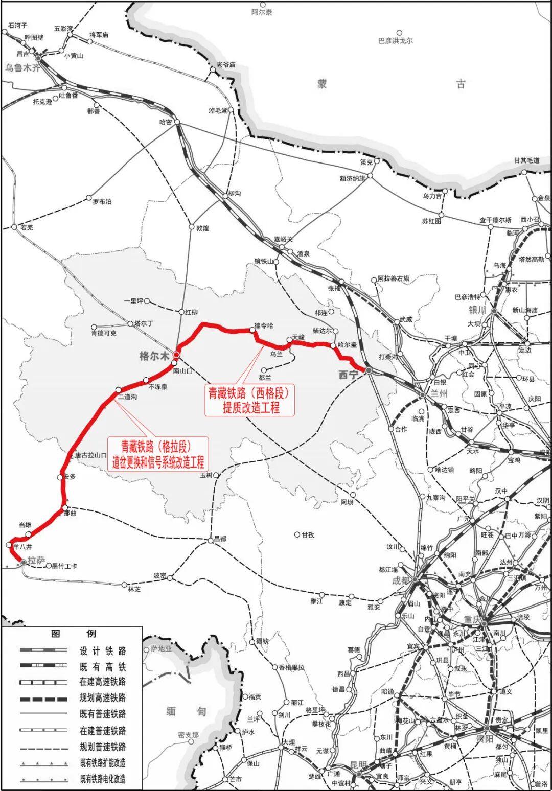 Xining-Golmud section of Qinghai-Tibet Railway: The total length of the line is 759.78 kilometers. The quality improvement project will be carried out on the existing line from Xining to Xining West of Lanqing Line and from Xining West to Golmud of Qinghai-Tibet Line. Remediation: Reinforce passenger transport facilities at Huangyuan, Haiyan, Ulan, Delingha and other intermediate stations with large passenger traffic, and build a new passenger terminal building at Haiyan Station, and expand the station building and supporting facilities at Delingha Station ; Adapt the Xining EMU operation station to meet the maintenance operation of the power-concentrated EMU; reconstruct the problem bridges and culverts along the line, and drive the power-concentrated EMU with a speed of 160 kilometers per hour on the basis of the current line.