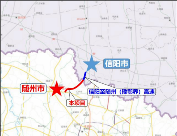 The Suizhou-Xinyang Expressway starts from the north of Maping Town, Suizhou City, connects to the Ma'an Expressway, passes through the west of Guanmiao Town and the west of Caihe Town, passes through Santan, and connects with Xinyang, Henan Province near Pingjingguan at the provincial border. On the main line, 5 interchanges will be set up in Suizhou East, Xihe, Yudian, Caihe and Santan, and 4 ramp toll stations, 1 service area, 1 monitoring sub-center and 1 maintenance area will be constructed simultaneously. The estimated total investment of the project is 6.356 billion yuan, the construction mileage is about 47.518 kilometers, the roadbed width is 26 meters, the two-way four-lane, the design speed is 100 kilometers per hour, and the Xihe connecting line is set up in the Xihe Interconnection to connect to the 316 National Road, and the total length of the connecting line is about 6.1 kilometers. . The project is invested and constructed by six companies including Hubei Communications Investment Group Co., Ltd. and China Gezhouba Group Co., Ltd., with a construction period of 36 months. On June 2, 2022, the Suizhou-Xinyang Expressway project was officially approved by the Provincial Development and Reform Commission.