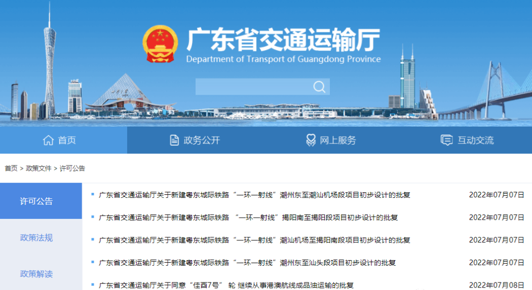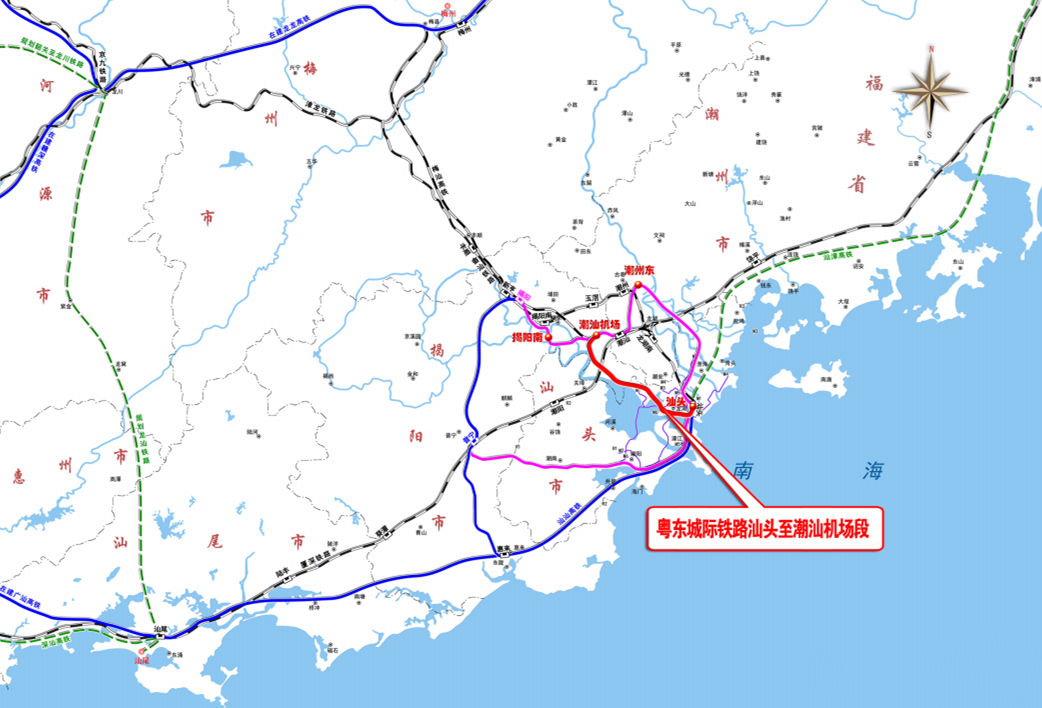 From July 8th to 11th, 2022, the Guangdong Provincial Department of Transportation has successively released the new East Guangdong Intercity Railway, one ring and one ray, Shantou to Chaoshan Airport, Jieyang South to Jieyang, Chaozhou East to Shantou, Chaoshan Airport to Jieyang Approval of the feasibility study reports for 5 projects in the southern section and the Chaozhou East to Chaoshan Airport section.