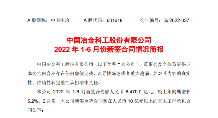 A few days ago, China Metallurgical Metallurgical Corporation issued a business announcement from January to June 2022: the newly signed contract value from January to June 2022 was RMB 647 billion, an increase of 5.2% over the same period of the previous year. Judging from the average monthly growth rate of China Metallurgical Corporation, it is very difficult to achieve close to double-digit growth, and it is also very strong.