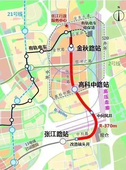 Rail Transit Line 13 East Extension Project Zhangjiang Road Station (exclusive) to Jinqiu Road Station, the line starts from Zhangjiang Road Station of Line 13 Phase III, and ends at Shanghai Integrated Circuit Design Industrial Park. Road—Walk on Zhangdong Road. The total length of the line is 4.1km, all of which are laid underground. There are 2 stations on Gaoke Middle Road and Jinqiu Road (transfer to Zhangjiang tram).