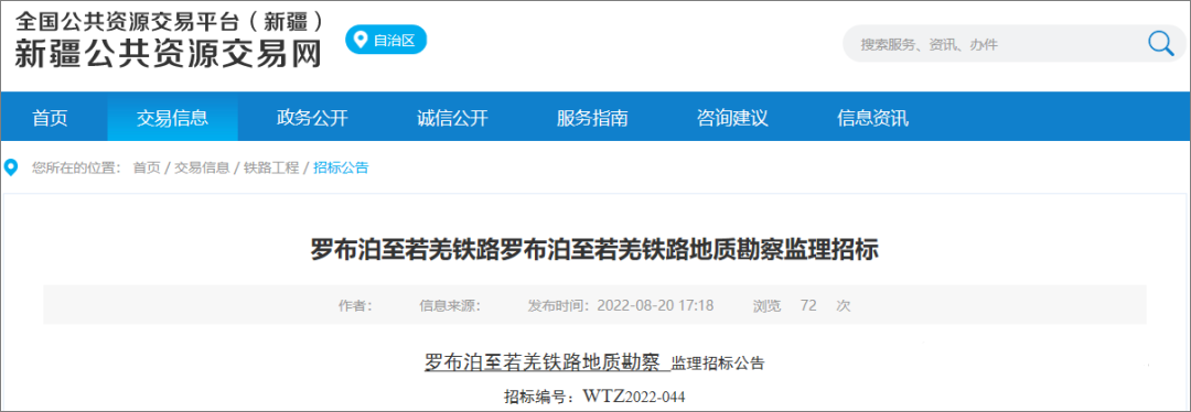 Bidding scope: Category I changes or complex geological survey supervision work in the preliminary survey, fixed survey, supplementary survey phase and implementation phase of the Lop Nur to Ruoqiang railway geological survey.