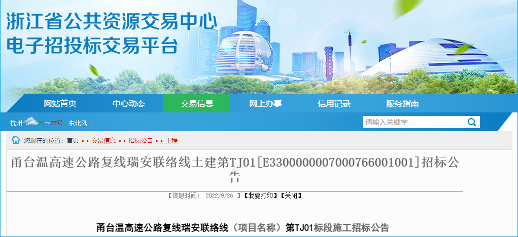On September 27, 2022, the Zhejiang Public Resource Trading Platform released the tender announcement for the civil construction of the Ruian liaison line of the Yongtaiwen Expressway double-track. The total investment is about 18.934 billion yuan.