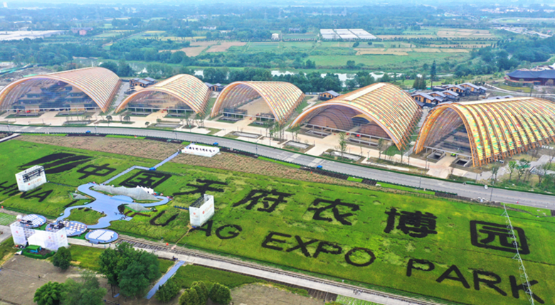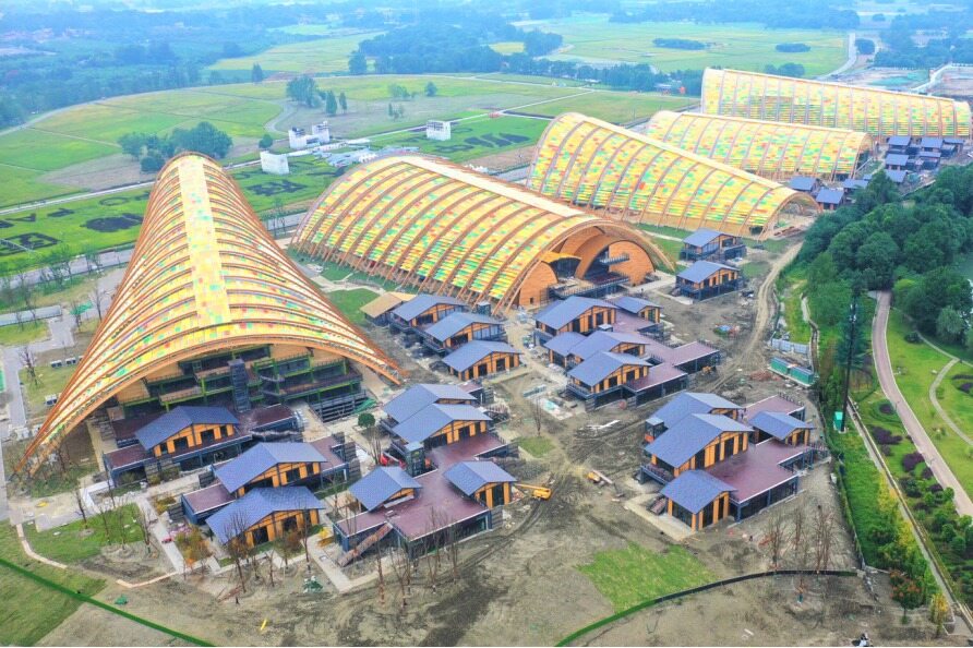 The main exhibition hall of Tianfu Agricultural Expo Park has a total construction area of 130,000 square meters. In a field, there are five huge arch buildings, which are magnificent in momentum and primitive rough and plain. They are in harmony with the surrounding fields, meaning "Tankan harmony and rice waves rolling".