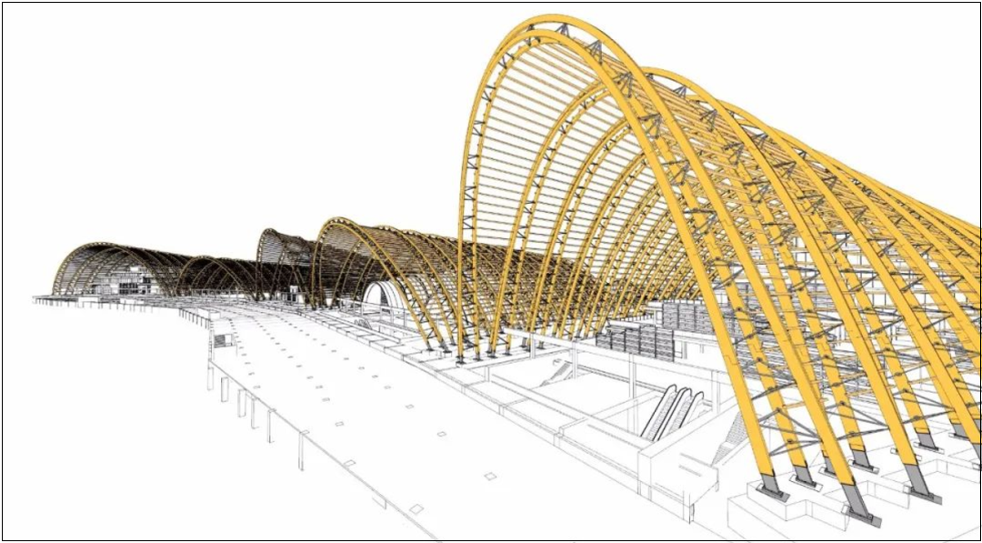 The five huge arched building vaults feature unique Vierendeel style trusses, the world's first steel-wood mixed fasting truss arch, the upper and lower chord bars are glulam wood, and the belly bars are triangular shaped steel structures. The whole roof is CNC machined wood purlin + ETFE membrane structure system, the maximum span is 118 meters, the highest point is 43 meters. The combination of the arch frame and the colorful ETFE membrane roof is stunning, becoming a milestone in wood and membrane architecture in the world.