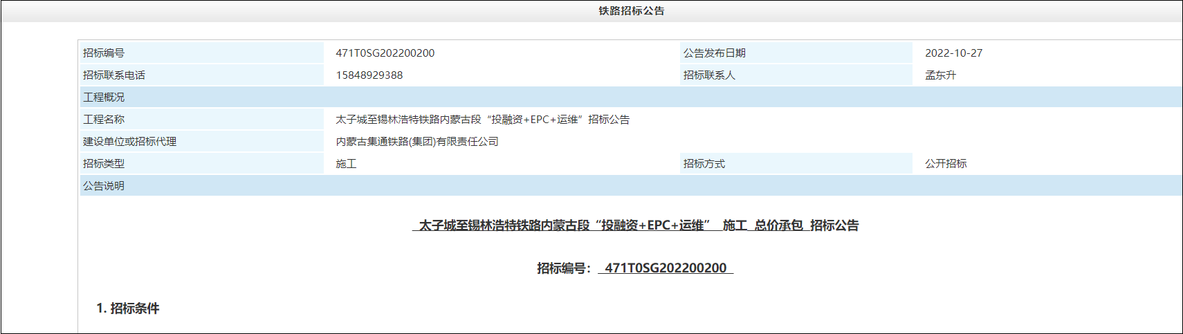 On October 27, 2022, the Beijing Construction Engineering Information Network released the bidding announcement of investment and financing+EPC+total price contracting for operation and maintenance of Inner Mongolia Section of Taizicheng Xilinhot Railway. The bid inviter of the project is Inner Mongolia Jitong Railway Group Co., Ltd., with a total investment of 2.855 billion yuan.