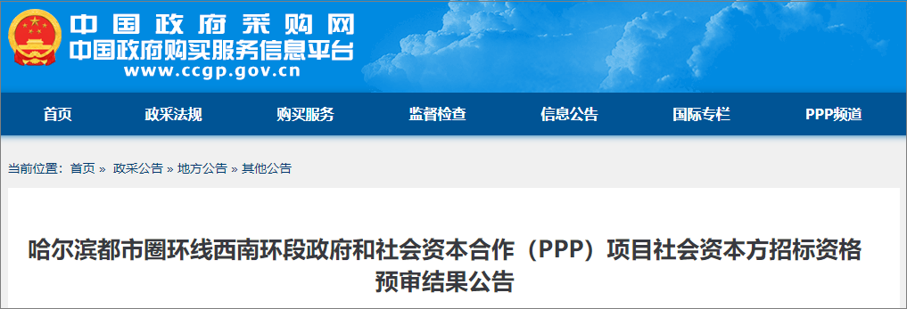 A few days ago, the Chinese government purchase service information platform released the announcement of the pre qualification results of the government and social capital cooperation project in the southwest ring of the Harbin Metropolitan Ring Road. The project was won by the consortium of Heilongjiang Construction Investment Group Co., Ltd. The total investment in the project is estimated to be 12.304 billion yuan, and the corresponding total investment in PPP projects is 10.309 billion yuan.