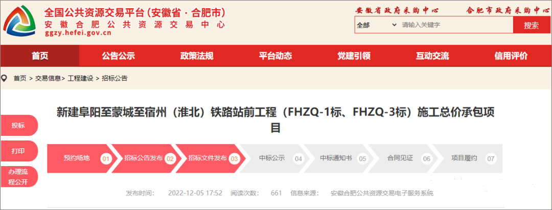 On December 5, 2022, the bidding announcement for FHZQ-1 and FHZQ-3 lump sum construction contracting projects of the new Fuyang Mengcheng Suzhou Railway Station Project will be released. The remaining sections of the newly-built Fuhuai Intercity Railway will start the construction bidding, and will enter the construction stage of the whole line in January next year. It is planned to be completed in March 2026. Previously, the construction of Fuhuai High Speed Railway Lot 2 and Lot 4 was officially started in October this year.