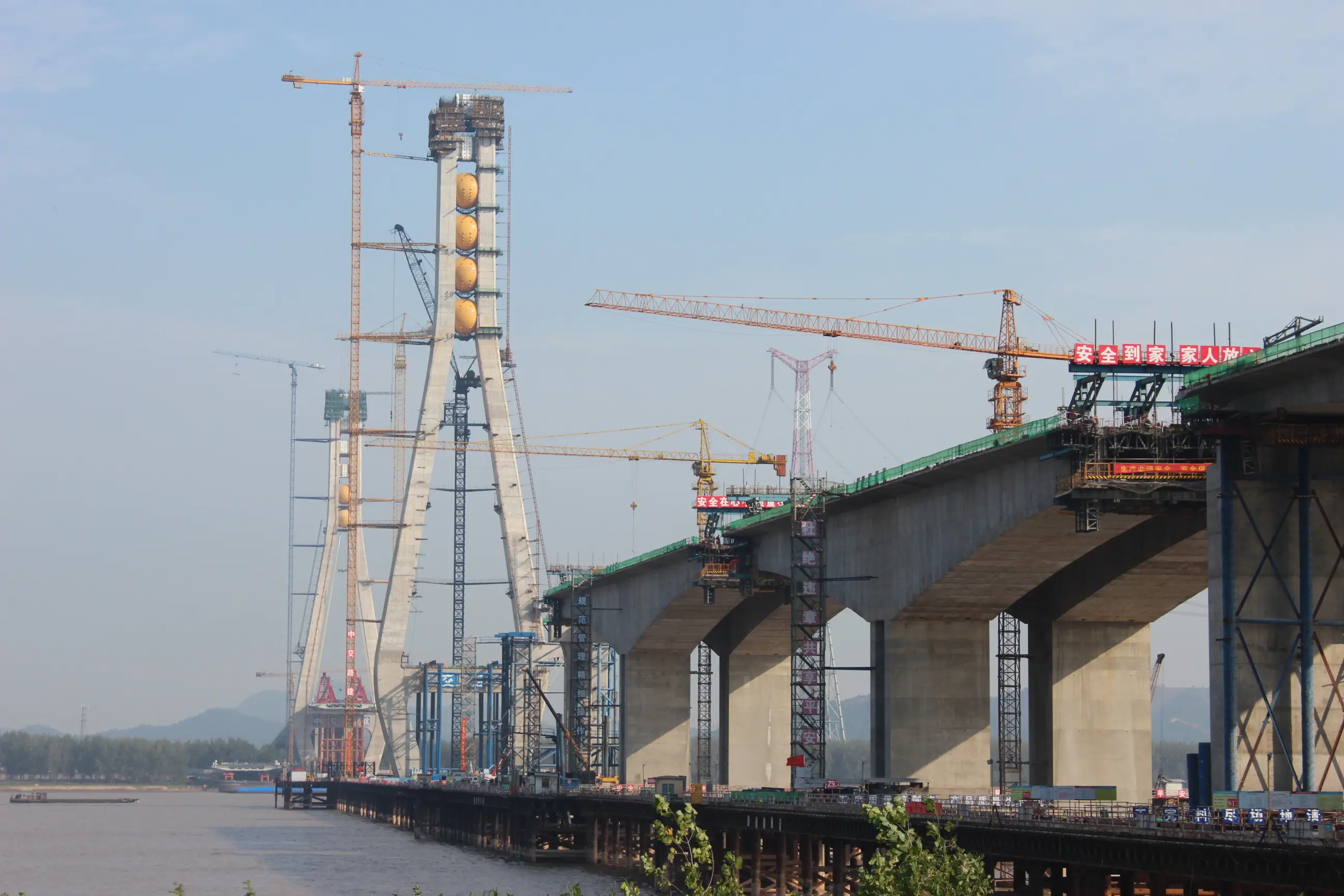 The total length of Chizhou Yangtze River Road Railway Bridge Project is 3108.5m, of which the main bridge is a double deck steel truss cable-stayed bridge with a span of (100+378+812+364+114) m; The simply supported steel truss composite beam with a span of 140m is used for the north bank across the embankment, and the concrete beams with a span of 40.7m and 32.7m are used for the other approach bridges.