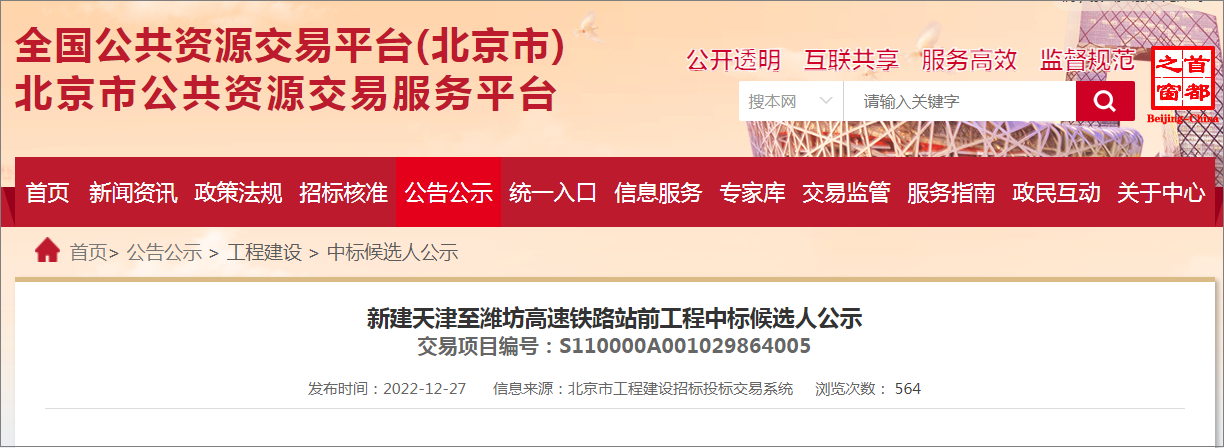 On December 27, 2022, the Beijing Public Resources Trading Service Platform announced the candidates for winning the bid for the new Tianjin Weifang High Speed Railway Station Project. The project is divided into nine bid sections, which were won by 9 units, including China Railway Construction Bridge Engineering Bureau and China Railway Seventh Bureau. The total bid price is about 22.45 billion yuan.