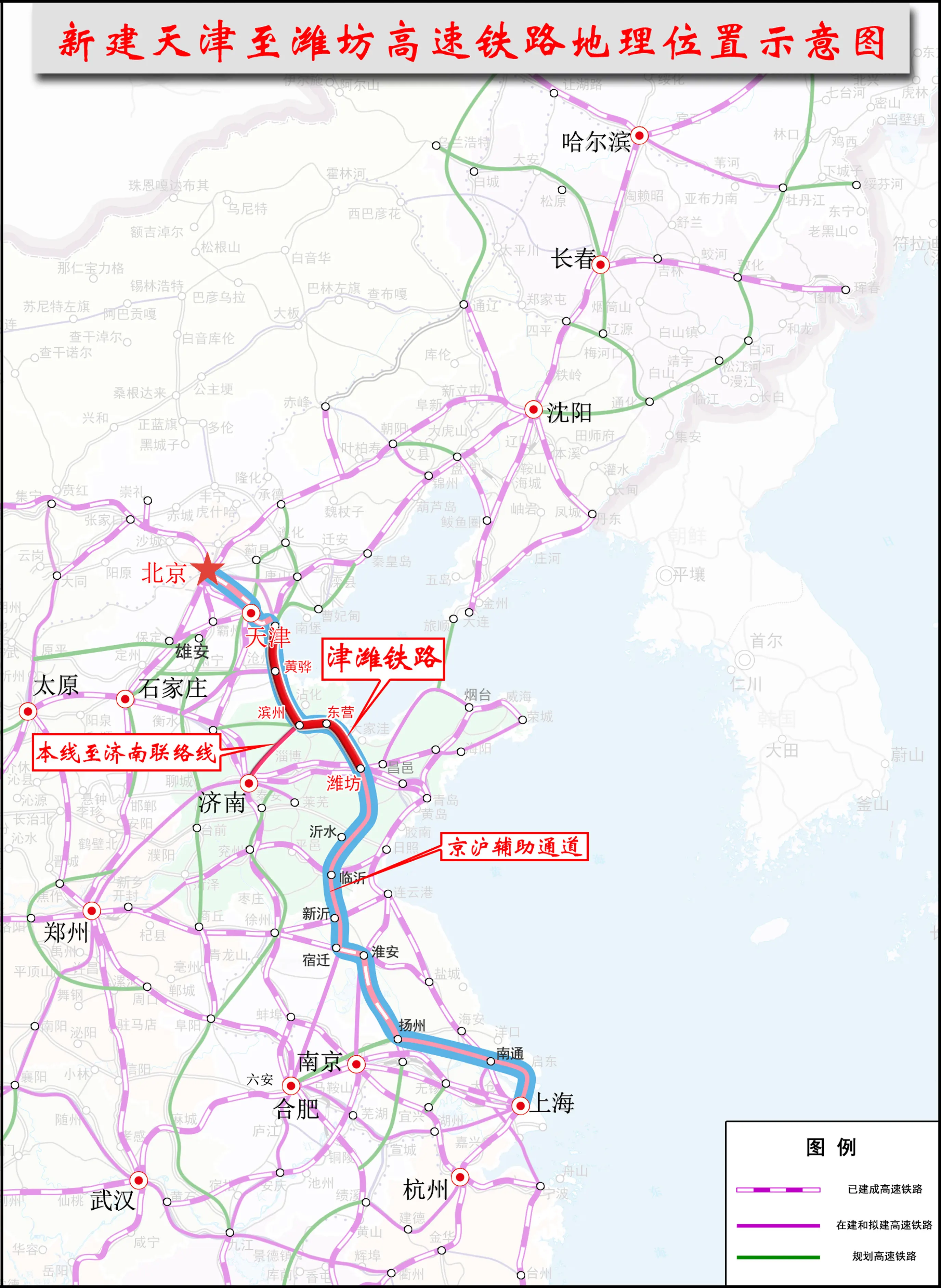 The newly-built Tianjin Weifang high-speed railway line starts from Binhai Station of Tianjin Terminal, passes through Binhai New Area of Tianjin, Cangzhou City of Hebei Province, Dezhou City, Binzhou City, Dongying City and Weifang City of Shandong Province, and ends at Weifang North Station of Jiqing High speed Railway. The main line is 348.257 km long, with 10 stations. Expansion of Binhai West EMU Operation Station, construction of Tianjin Weijin Qinhuangdao connecting line, Tianjin Weijing Binhai connecting line and other supporting projects of Tianjin hub. New Tianjin Weihai Jinan Qingdao connecting line, Weifang North Depot, Dongying South Depot, Binzhou Station, Dongying South Station, Weifang North Station and other related supporting projects.