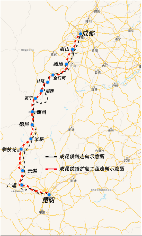 The new Chengdu Kunming Railway starts from Chengdu South Railway Station, passes through Chengdu, Meishan, Leshan, Liangshan Yi Autonomous Prefecture, Panzhihua, Yunnan Chuxiong Yi Autonomous Prefecture, Kunming, and ends at Kunming Station. It is a national level I double track electrified railway with a total length of 915km and a set time speed of 160km. Since the official commencement of construction in 2007, China Railway Shanqiao has provided the turnout products required for the Yongren Guangtong section expansion and reconstruction project of the line by adopting the segmented construction and segmented operation mode.