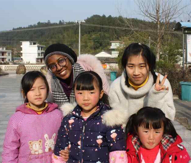 Shiyu (second from left) took a group photo with local children when she was teaching in Ji'an, Jiangxi