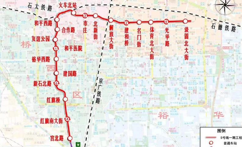 The first phase of Shijiazhuang Urban Rail Transit Line 5 starts from Gongbei Road Station and ends at Tangu North Street Station. It is laid along Hongqi Street and Youyi Street in the north-south direction. After connecting Shijiazhuang North Station, it runs along Shizhuang Road and Guanghua Road. It is laid in east-west direction, with a total length of about 19.9 kilometers, all of which are underground lines. There are 18 stations, including 6 transfer stations. The Gongjiazhuang vehicle base and the Hongqi main substation will be newly built. The total investment of the project is 17.07 billion yuan.