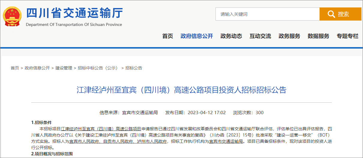 On April 12, 2023, the Sichuan Provincial Department of Transportation issued a tender announcement for investors in the Sichuan border project of the Jiangjin-Luzhou-Yibin Expressway. billion.
