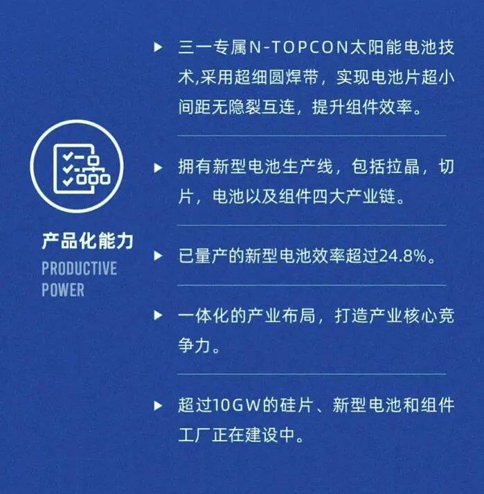 In December 2022, the off-line of photovoltaic module products announced that Sany Silicon Energy has successfully opened up the entire photovoltaic industry chain, with independent research and development and production capabilities from crystal pulling, slicing, batteries to modules, and also declared that Sany Silicon Energy has officially Enter the camp of vertical integration of photovoltaic industry. At present, Sany has more than 10GW of silicon wafers, new cell and module factories under construction.