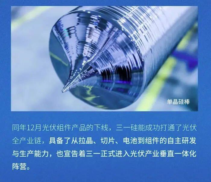 On May 4, 2023, Sany Group's official Weibo posted a post "The Future Has Come!" Sany is steadily entering the photovoltaic industry! "The article shows that in November 2022, the first monocrystalline silicon rod produced by Sany Silicon Energy was successfully released in the Energy Industrial Park, announcing that Sany Silicon Energy has officially entered the stage of production and operation.