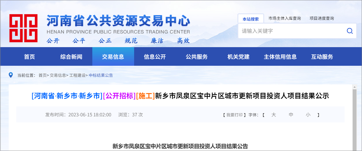 On June 13, 2023, Henan Tendering Network released the announcement of the successful candidate for the urban renewal project in Baozhong District, Fengquan District, Xinxiang City, with a total investment of about 5 billion yuan.