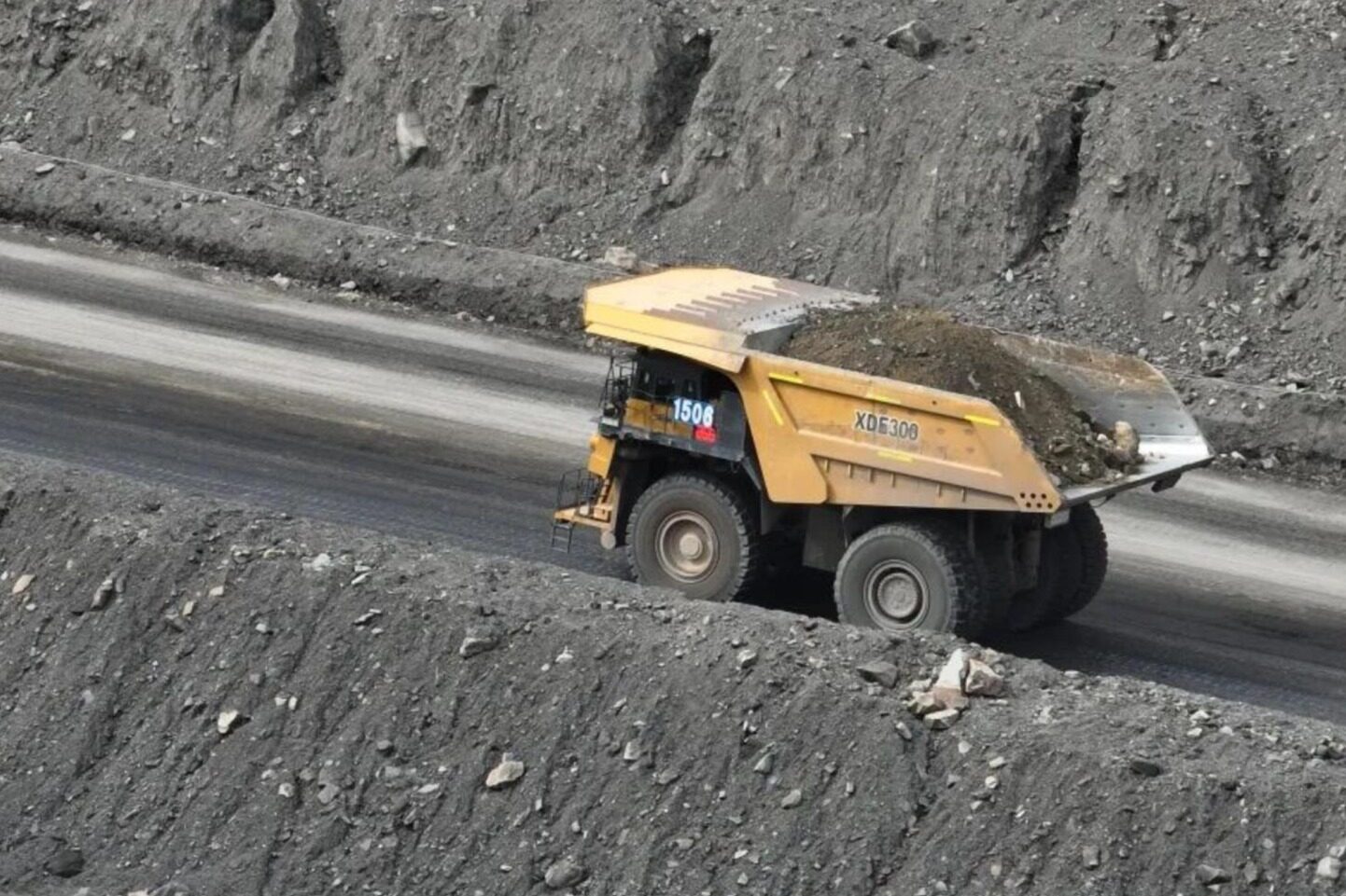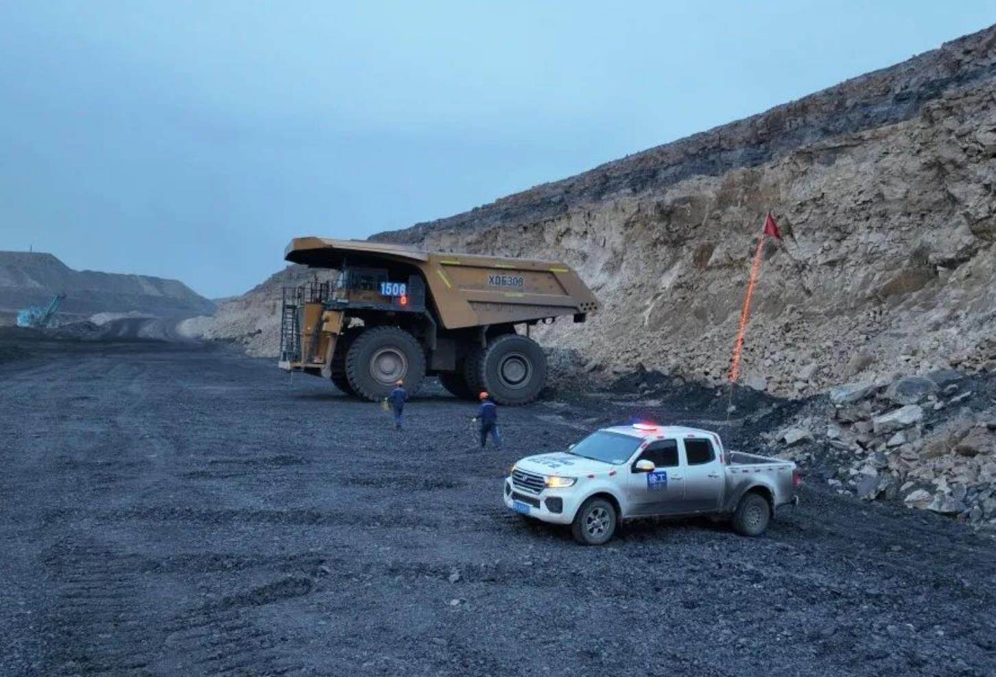 On the Mercedes Benz back and forth mining road, XCMG's 300-ton mining truck sped past, leaving deep rut marks on the vast northern land with its golden body, resembling a land armored tank, with strong strength.