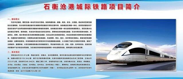 The design speed of the intercity railway is 250 kilometers per hour and the whole line is about 334 kilometers. It crosses the three cities of Shijiazhuang, Hengshui and Cangzhou, traverses 17 counties (cities and districts), connects Jizhongnan and Cangzhou Huanghua Port, and is the center of Hebei Province. The important economic belt, development belt and livelihood belt in the southern region. Among them, Cangzhou Section has Jiaohe Station, Botou West Station, Confucian Temple Station, Cangzhou West Station, Cangzhou East Station, Cangzhou Airport Station (reserved), Huanghua New Station, Bohai New District West Station and Bohai New District Station. According to the schedule, the railway strives to be completed and put into operation in 3.5 years.
