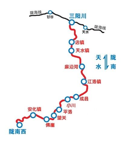 The newly-built Tianshui-Longnan line leads from Sanyangchuan Station of Longhai Railway, passes through the middle beam to the South Long Tunnel (L-12.86km), crosses the Borneo River, Lianhuo Expressway (G30), National highway G316 to the estuary of Nangou River, along the foot slope of Nangou River, through the suburb of Zaojiao with a length of 10.60km through the watershed of Weihe River and Jialing River to Tianshui Town. G316 goes south, passes Jiangluo and Niyang, then turns southwest to the southwest side of Chengxian County (southeast of Shaoxa Town). After exiting Chengxian Station, the line continues to the southwest, passing the Xiaochuanyi Bridge (L-636.1m , H-100m) across the West Hanshui to Pingluo, then the foot slope along the Pingluo River along the left bank of the Pingluo River is dominated by bridges and tunnels, parallel to the Chengwu Expressway, passing Wangguan and Foya and crossing the Western Han with a 16.00km tunnel Watershed and Bailongjiang Watershed——Micangshan to Anhua Station. After exiting the station, the route runs down the Beiyu River to the southwestern foot slope. Through Majie, the 7.33km tunnel passes through the watershed between Beiyu River and Gouba River to Liangshui Station. After exiting the station, it will be along the Gouba River and the west end will be cleared and introduced into Longnan West Station.