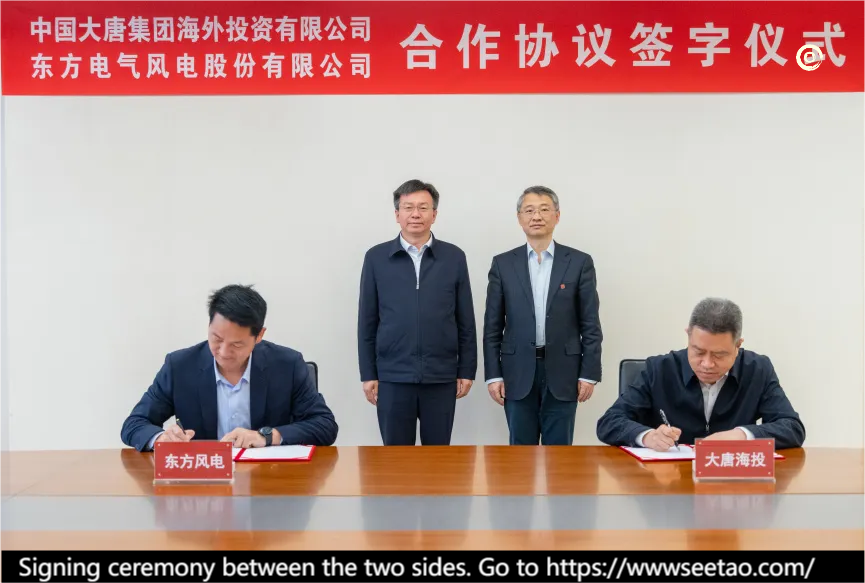 On April 17, 2024, China Datang Group Overseas Investment Co., Ltd. and Dongfang Electric Wind Power Co., Ltd. signed a cooperation agreement at the headquarters of China Datang Group. Tao Yunpeng, member of the Party Group and chief accountant of China Datang Group Co., Ltd. and Li Zhongjun, member of the Party Group and deputy general manager of China Dongfang Electric Group Co., Ltd. jointly attended the signing ceremony and had a friendly and in-depth exchange on further strengthening the cooperation between the two sides.
