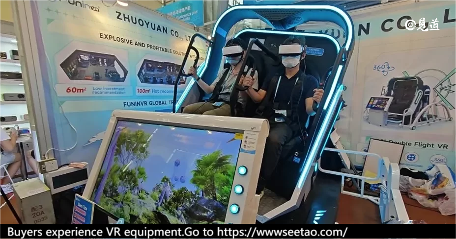 “Amazing”“Nice”…… Such praise in Guangzhou Zhuoyuan virtual reality Technology Co., Ltd. booth one after another. A two-person 360-degree rotating VR entertainment device and an immersive drifting racing device with a professional-grade racing simulation cockpit were crowded with buyers who came to experience it.