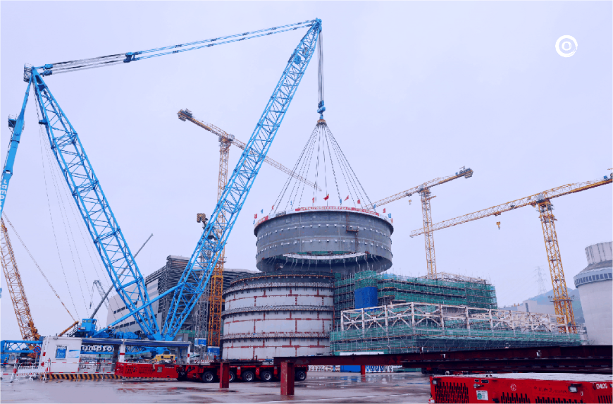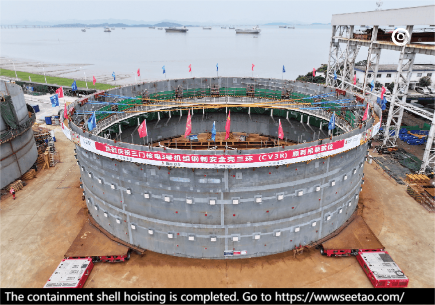 On June 5, 2024, Unit 3 of Sanmen Nuclear Power Plant successfully completed the hoisting of the three rings of its steel containment cylinder. The smooth realization of this important step marked the completion of the entire 6-7th floor of the shielded factory building SC. After the circle installation was completed, another key milestone was successfully reached.