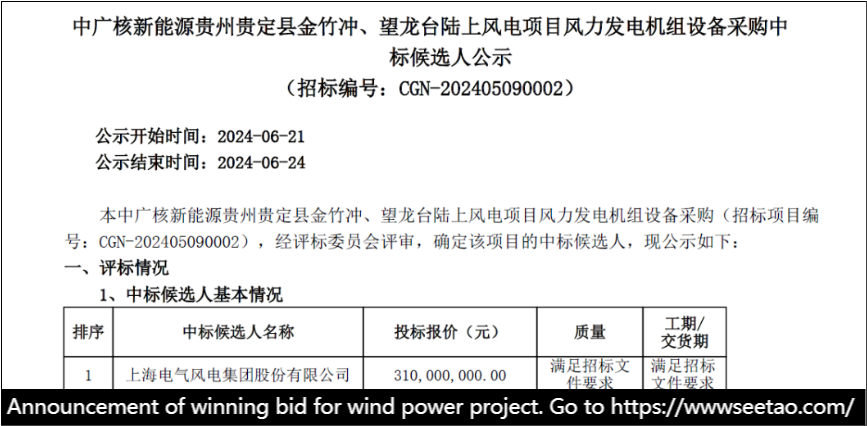 On July 22, 2024, it was learned that Electric Wind Power won the bid for the Jinzhuchong and Wanglongtai onshore wind power projects in Guiding County, Guizhou Province, of CGN New Energy. It will provide 16 onshore wind turbines for the 100MW Jinzhuchong onshore wind power project in Guiding County and the 100MW Wanglongtai onshore wind power project in Guiding County.