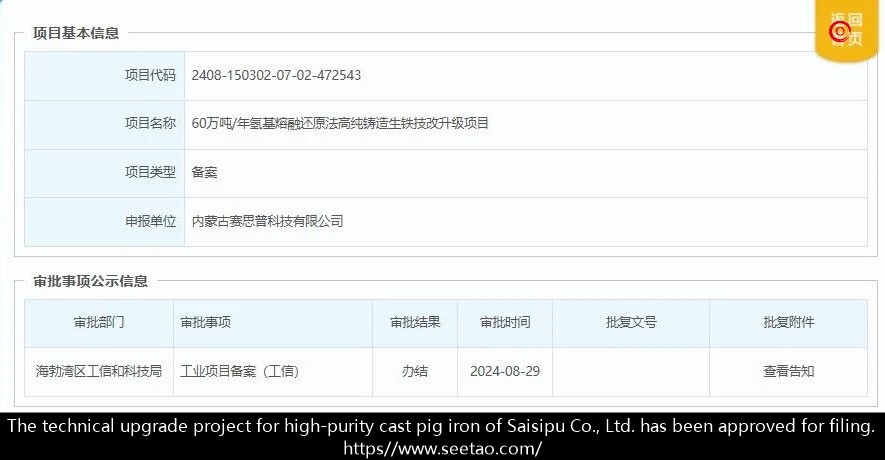 On August 29, 2024, Inner Mongolia Saisipu Technology Co., Ltd.'s 600000 tons/year hydrogen based smelting reduction method high-purity cast pig iron technology upgrade project was approved for filing.