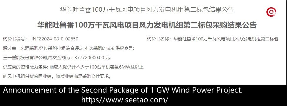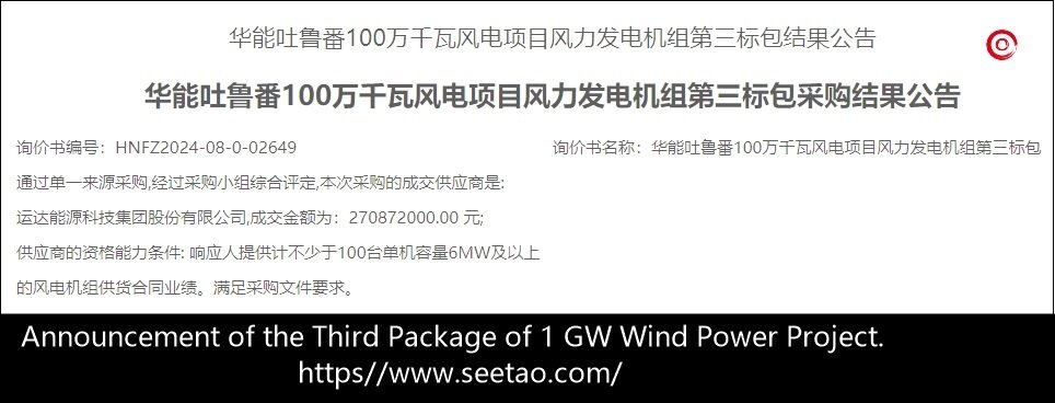 On September 11, 2024, the results of the single source procurement for the 1 million kilowatt wind power project of Huaneng Turpan were announced, with Yuanjing Energy winning the first bid package; Sany Heavy Industries won the second bid package with a total bid price of 377.72 million yuan; Yunda Co., Ltd. won the third bid package with a total bid price of 270.872 million yuan.