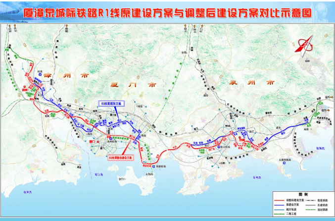 Xiamen Zhangzhou and Quanzhou Intercity Railway Line R1 is an intercity railway that runs through Xiamen, Zhangzhou and Quanzhou, with a total length of 175.13 km, passing through Quanzhou section of 71.5 km, Xiamen section of 53.4 km and Zhangzhou section of 50.2 km. With a total investment of about 72.7 billion yuan, the project plans to build 30 new stations (including 14 elevated stations and 16 underground stations) and reserve 4 stations for future expansion.