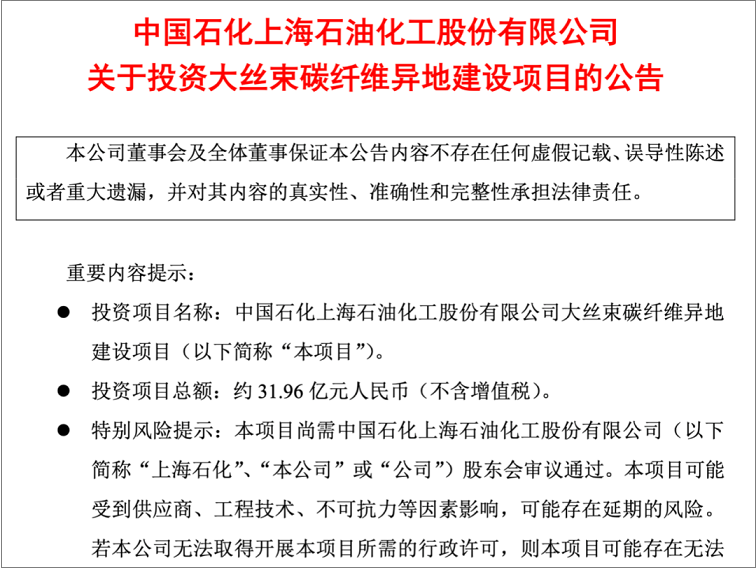 Sinopec Shanghai Petrochemical recently announced a major investment plan to build a new large-tow carbon fiber project with a total investment of approximately 3.2 billion yuan.
